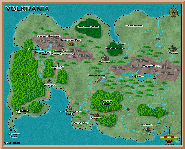 One of the most northerly countries on the continent of Erilya, Volkrania is effectively boxed in by the barren Eastlands and the Orcish Wildlands to the east. The weather varies: from bitterly-cold frosts, snowstorms, and gales in the winter where ice chokes some of the narrower straits of the seaboard; to hot, humid summers that bake the air itself. Even in the heat of high summer, it is not uncommon to see icebergs floating past Melora's Hand.